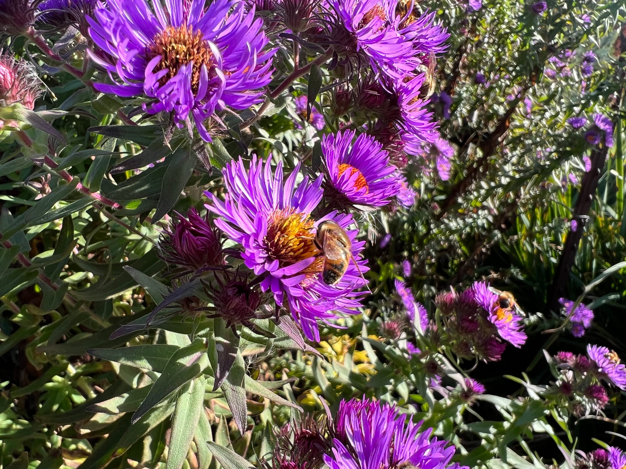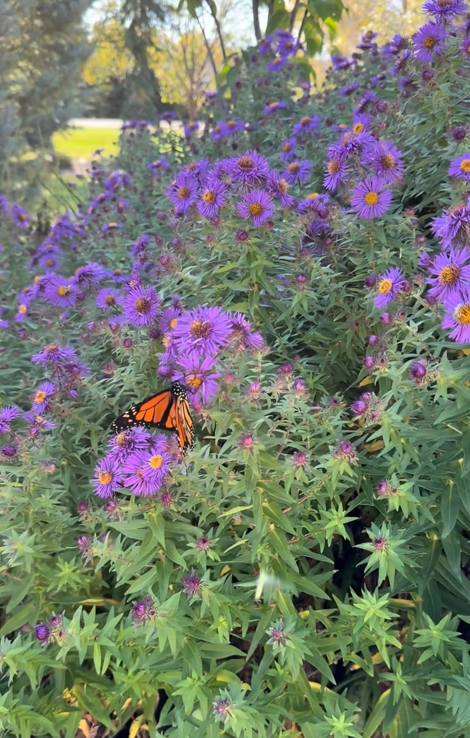 The Asters are one of the best perennials for late-season blooms. I don’t know the exact variety on this one pictured here, but it’s a bee magnet for us, all the way into October. Various Butterflies also love these flowers. This is a taller variety reaching 4-5 feet, but shorter varieties are also available in the trade.