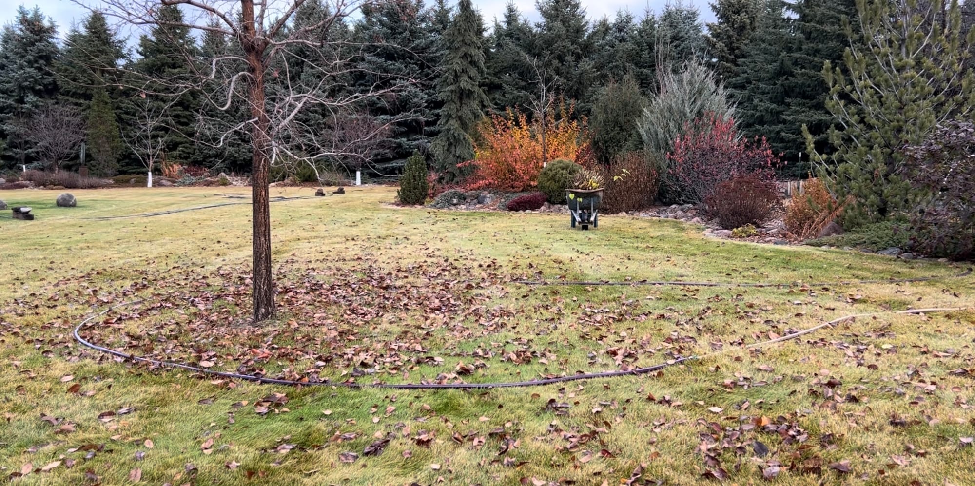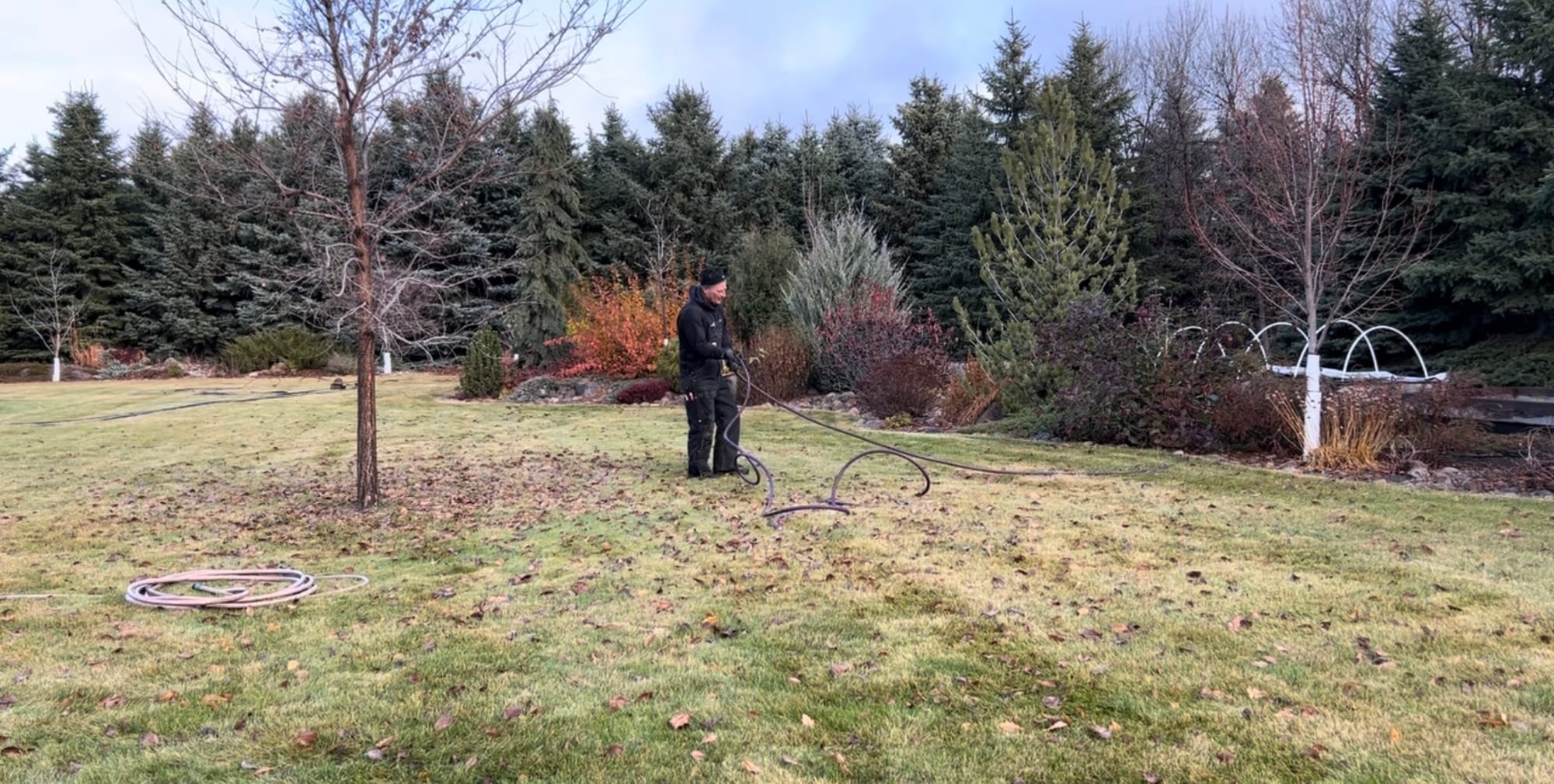 When creating new beds, I always like to lay out a garden hose to visualize how it will look before installing the edging. As you can tell by the leaves on the ground, this project started in the fall. When spring rolled around, I waited for the lawn to start growing, then sprayed an herbicide on the area to kill the grass. This is a lot easier than removing the sod and then filling the void with new soil.