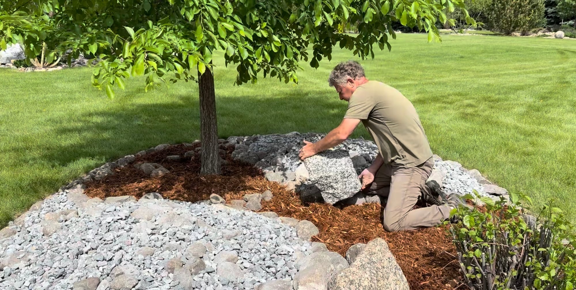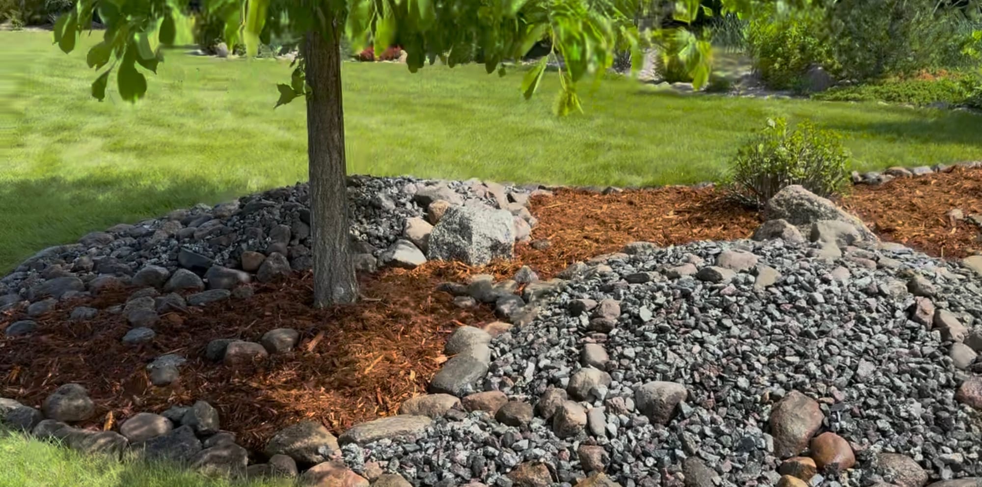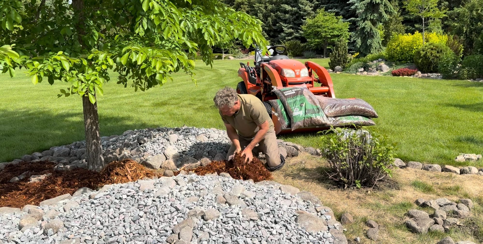 I also love using different-sized rocks and mulch together. The trick to keeping the mulch from contaminating or drifting into the rocks is to install the rock on the higher points within the beds. Using rock edging also helps, as it allows you to create a higher lip to keep the mulch, or rock, contained. And I avoid wood chips and prefer shredded mulches, as they’ll nest or bind together, so they're less likely to move in windy locations or during heavy rain events. The mulch I'm using here is a Western Red Cedar.