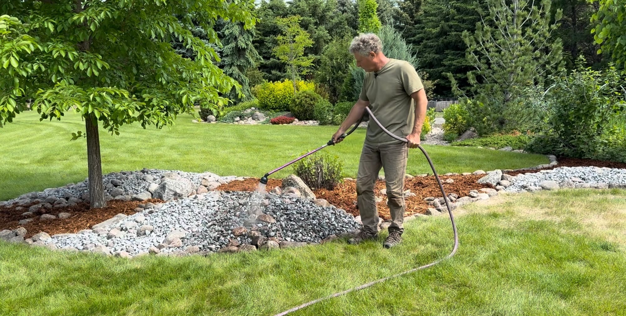 Rock is usually dusty and dirty coming from landscape supply centers, so washing it off at the end of the project really brings out the color ranges of the granite I’m using here.