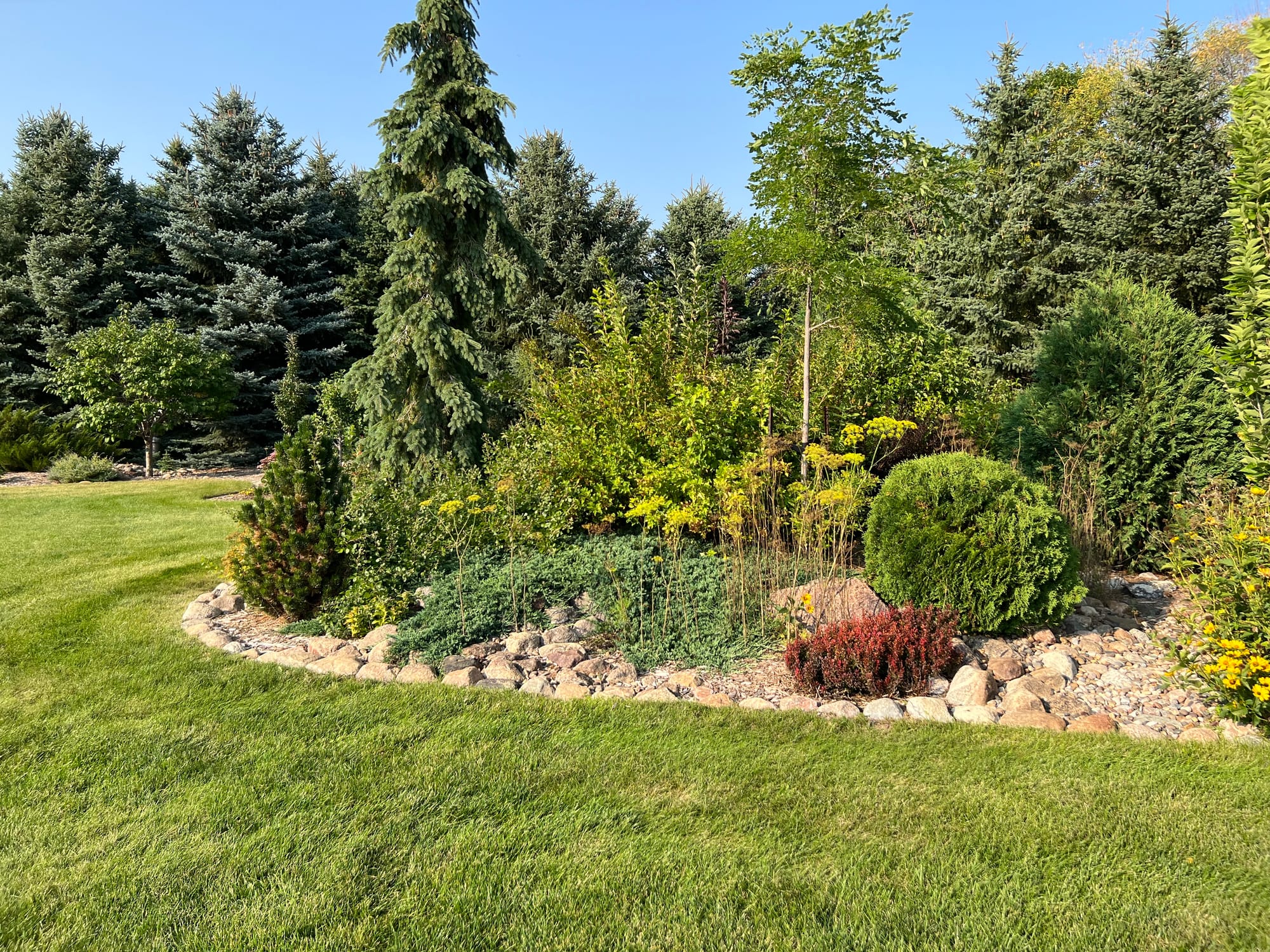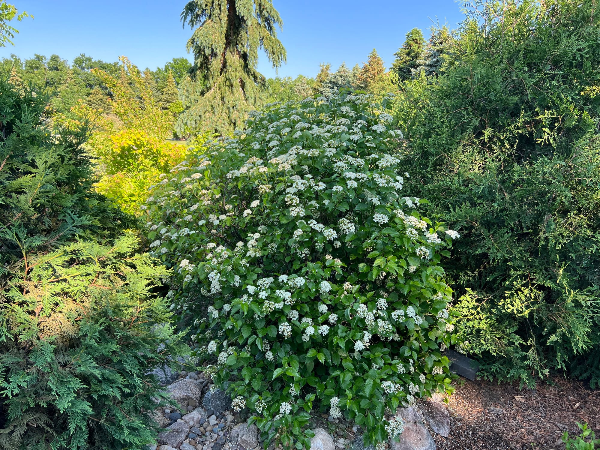 I’m guilty of over-planting, but this older bed shown above really pushed the limits on that (over-planting) problem. I recently did some major pruning here, and got it back in shape. I don’t mind pruning, but mostly I like to enjoy plants in their natural size and shape, which is always my main goal as I develop and plant out our landscape beds. But a Blue Muffin Viburnum was never going to realize its full potential as it was planted too close to two Techny Arborvitaes. And one Arborvitae was also starting to show injury from the shade of what wants to be, a large shrub.