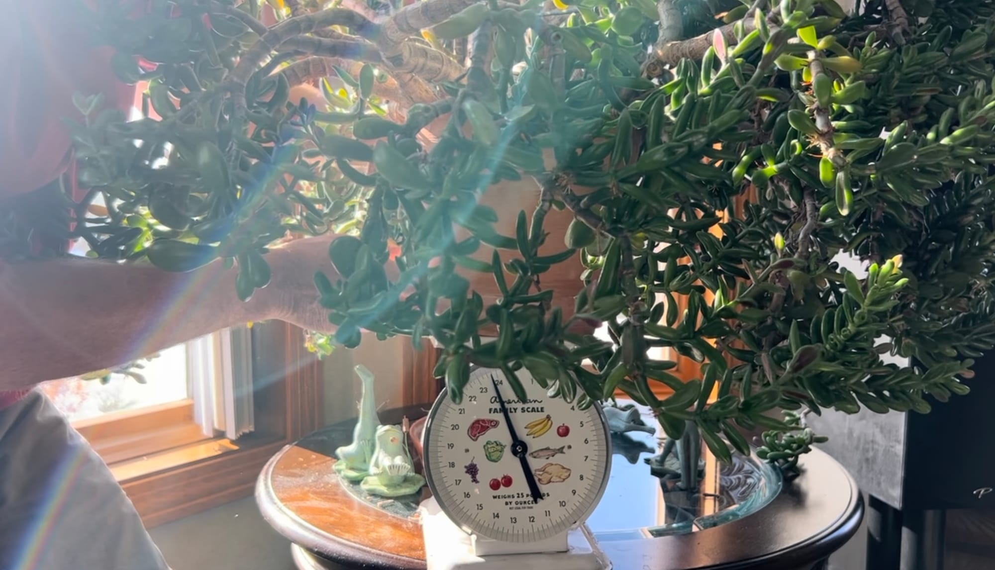 I recently repotted our Jade plant. It would have been fine for many years in the small pot it grew in, but it became too top-heavy and kept falling over. One time, after tipping, it fell to the floor! Jades are succulents, so their leaves can hold a lot of water. Take a look at the middle photo. Our champion has weighed in at 24 pounds!