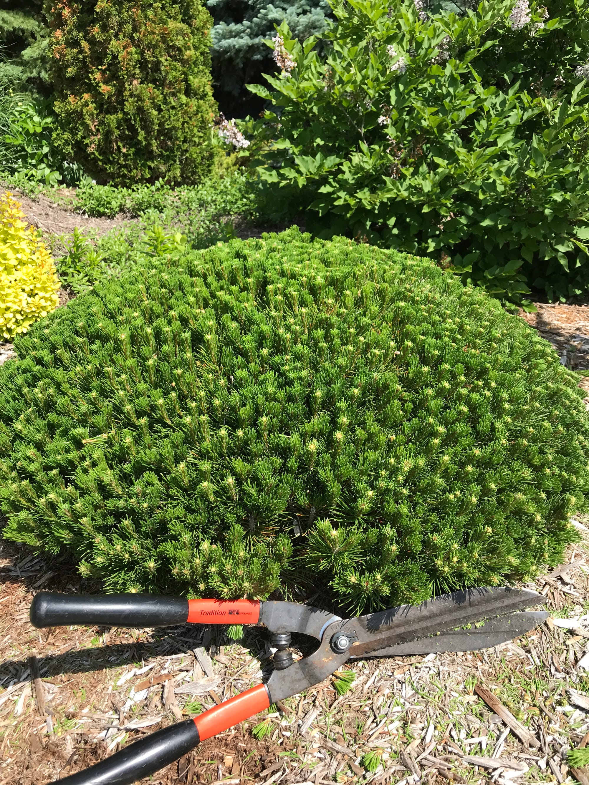Maintaining the shape of evergreen conifers is a yearly ritual. I wait until the growth or candles have elongated and just begin to open. At this point, I shear off approximately 1/2 to 2/3 of the candle (sometimes more). This shearing, done in late spring each year, is a one-time annual task that can keep evergreens small, shaped, and visually appealing for decades.