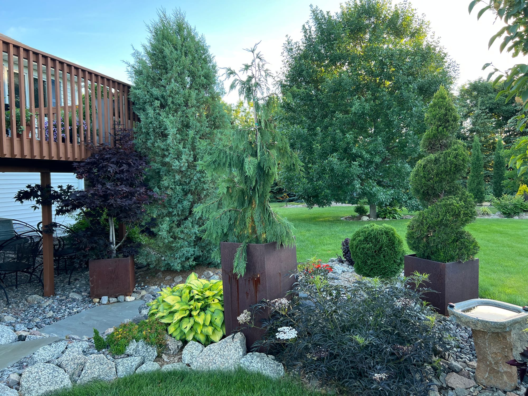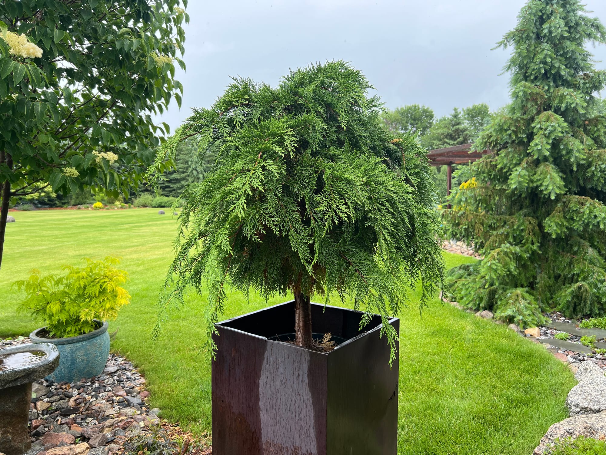 I'm surprised how long this False Cypress has thrived in its original container. I only prune the lower hanging branches each season, keeping this small tree form. I love how it looks in this tall metal container.