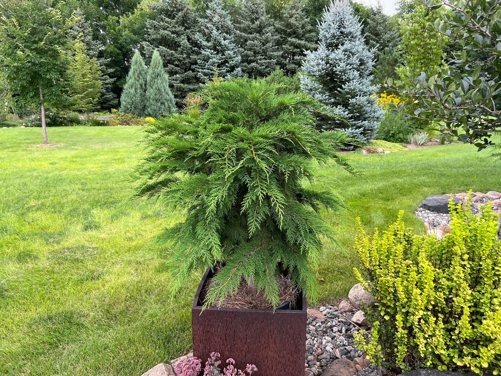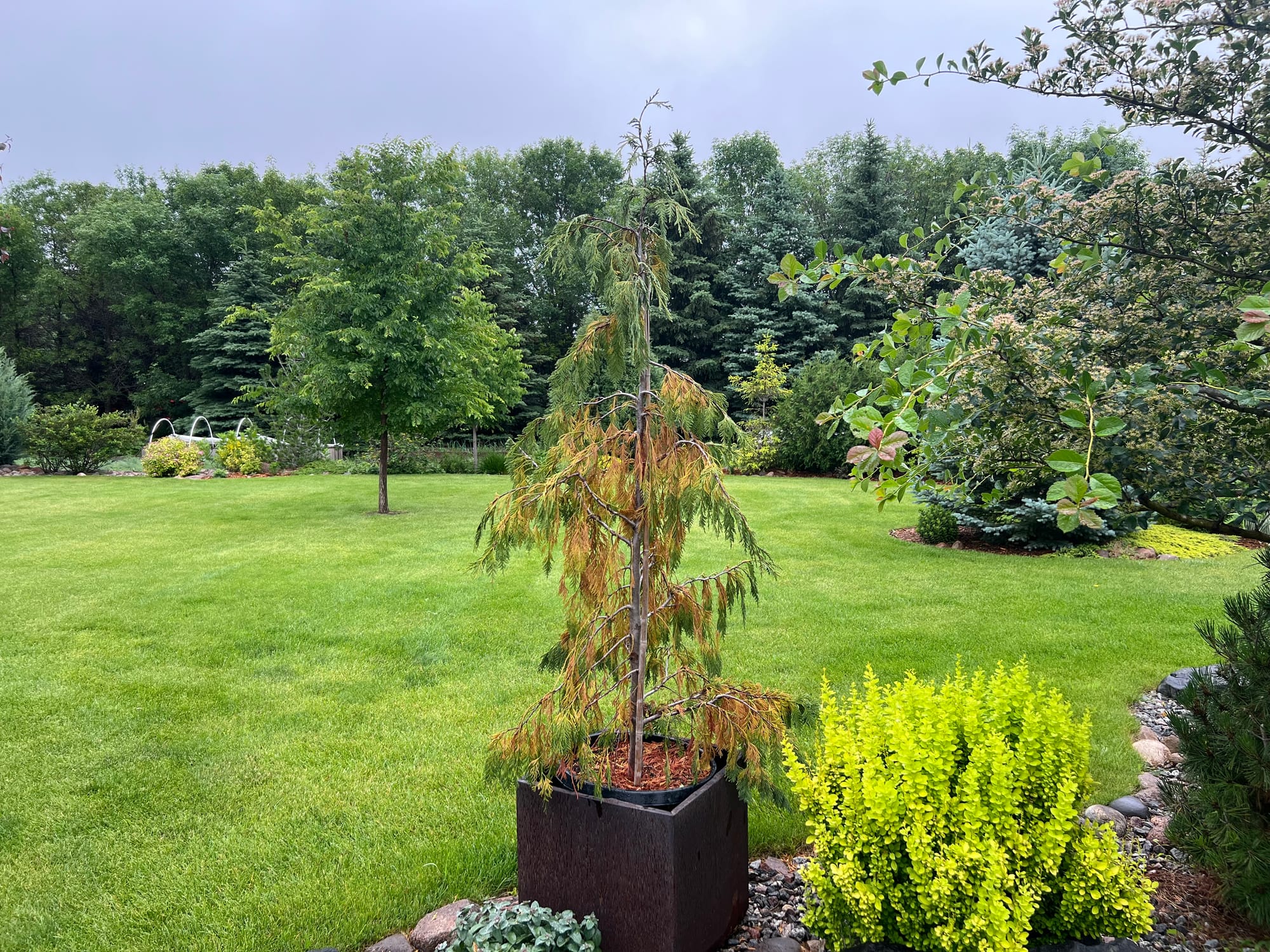 Eventually, it will become root-bound and look like this Alaskan Blue Weeping Cedar, now showing a lot of stress.
