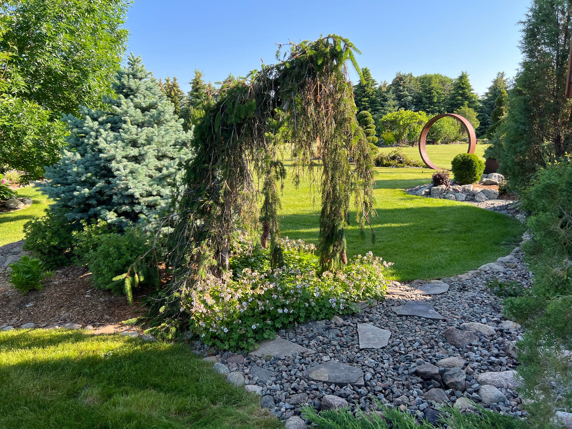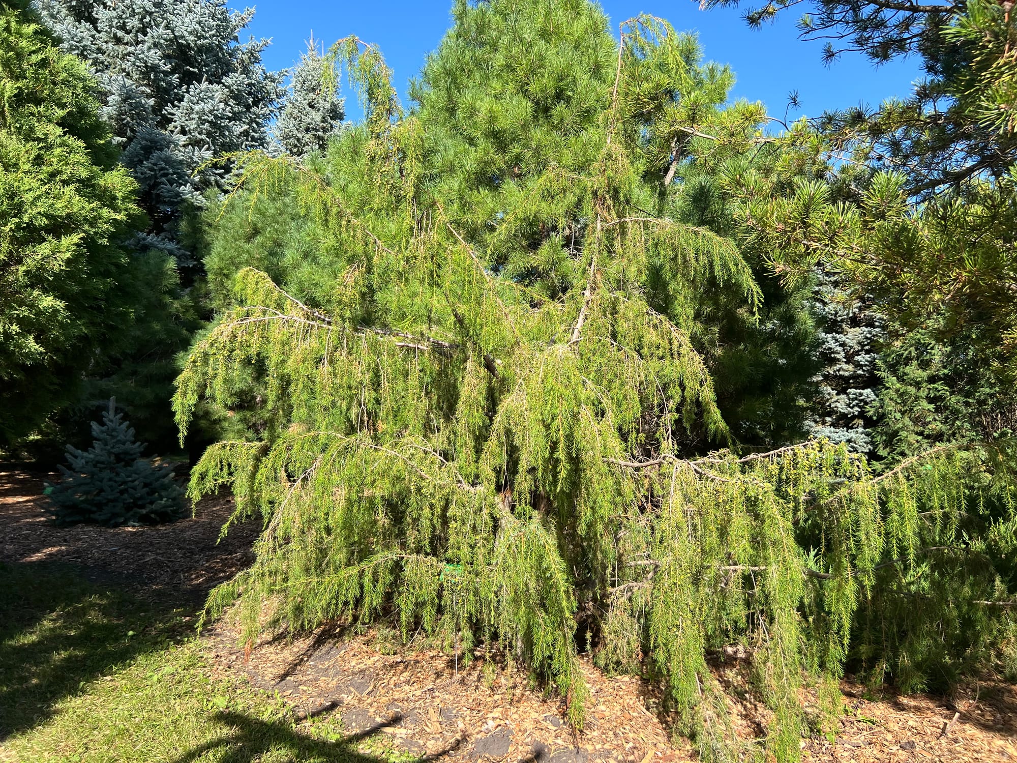 Tolleson’s Blue Weeping Rocky Mountain Juniper - Juniperus scopulorum ‘Tolleson’s Blue Weeping’ (Zone 3) | Weeping Needle Juniper - Juniperus rigida ‘Pendula’ (Zone 4) | Niagra Falls Eastern White Pine - Pinus strobus ‘Niagra Falls’ (Zone 3)